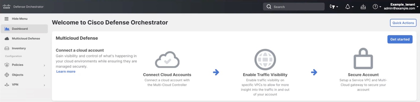 When you log into your CDO tenant, you will see a wizard that guides you through connecting your cloud accounts to Multicloud Defense so that you can manage them with a free 90-day trail of Multicloud Defense Controller. The 90-day trial experience offers the full functionality of a paid-subscription to Multicloud Defense Controller.