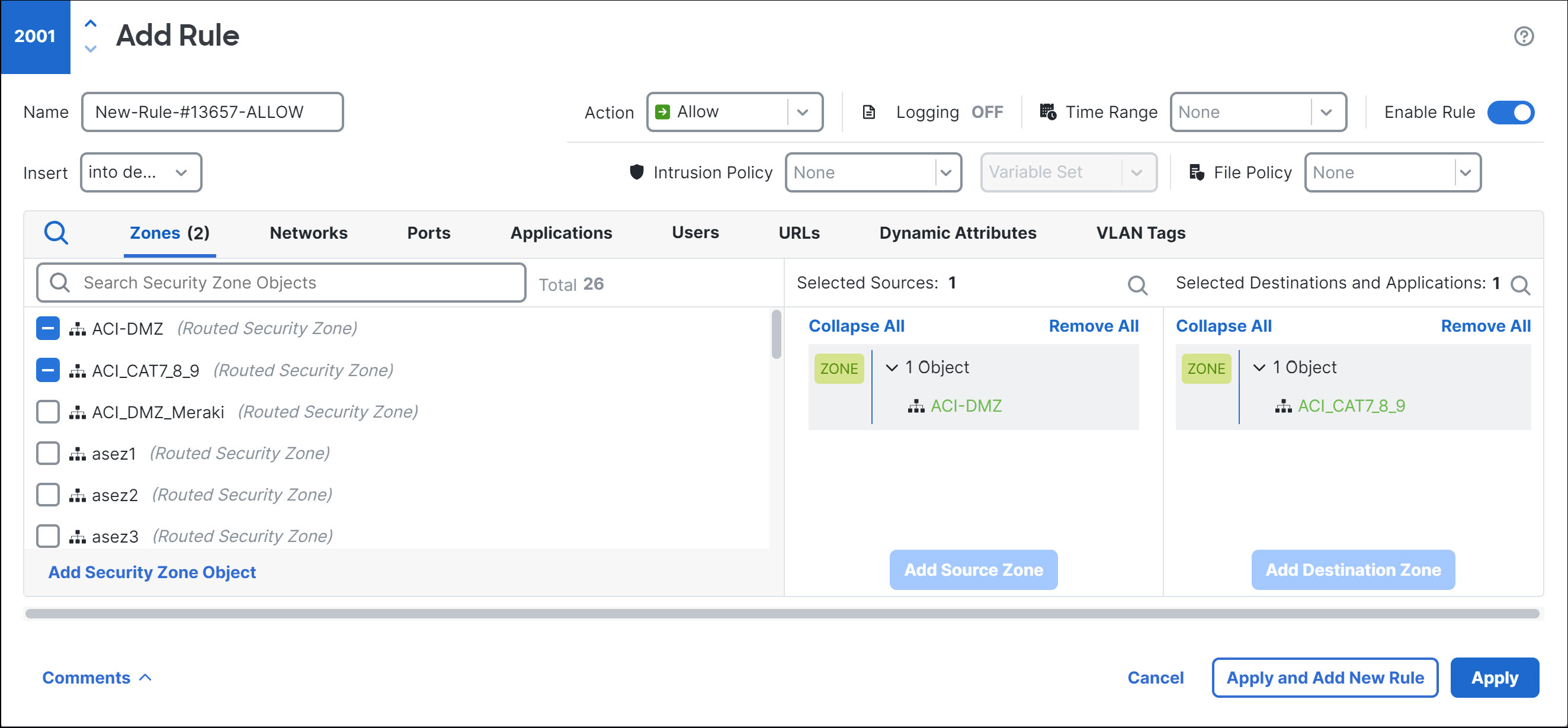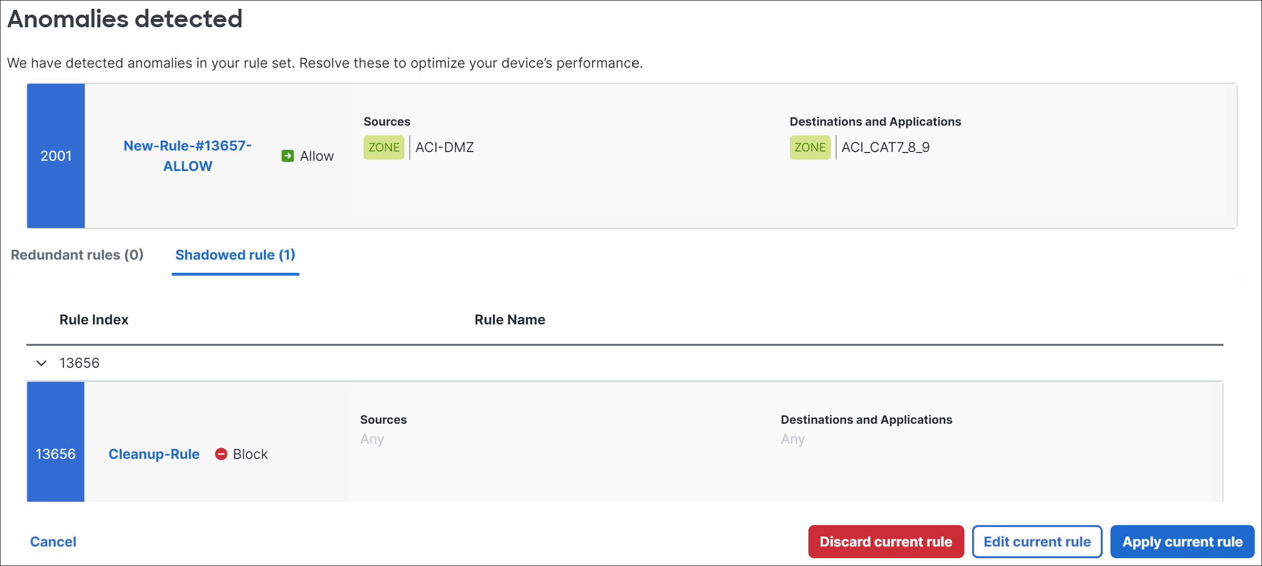 This section explains how the real-time Policy Analyzer and Optimizer feature in Cloud-Delivered Firewall Management Center automatically detects anomalies when you create a new rule or edit a rule. It also describes the options available in the interface for reviewing and resolving the detected anomalies. The same behavior applies when modifying an existing rule.