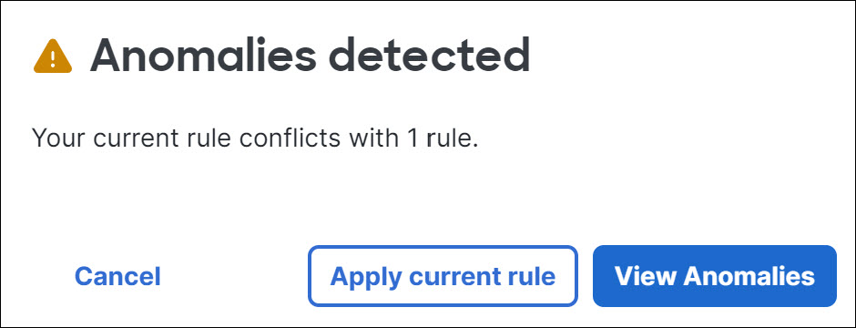 After defining the rule details and clicking Apply, the feature performs an automatic anomaly check on the new rule. If conflicts with existing rules are found, the Anomalies detected warning dialog box is displayed.