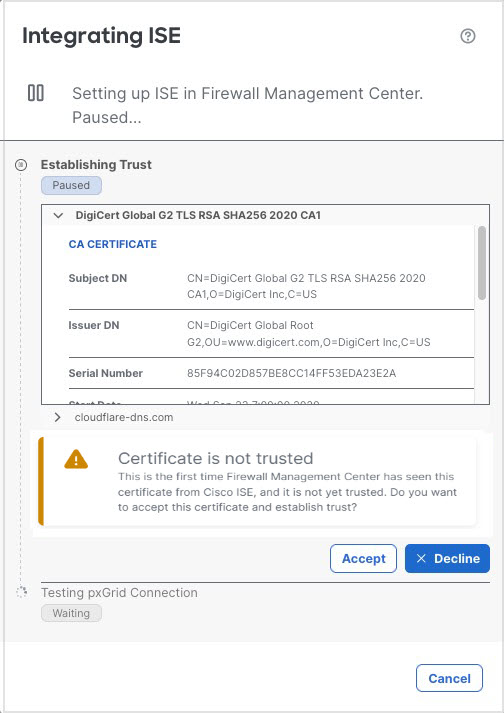 Optionally expand one of the lists under Testing pxGrid Connection to display certificates downloaded from those sources.
