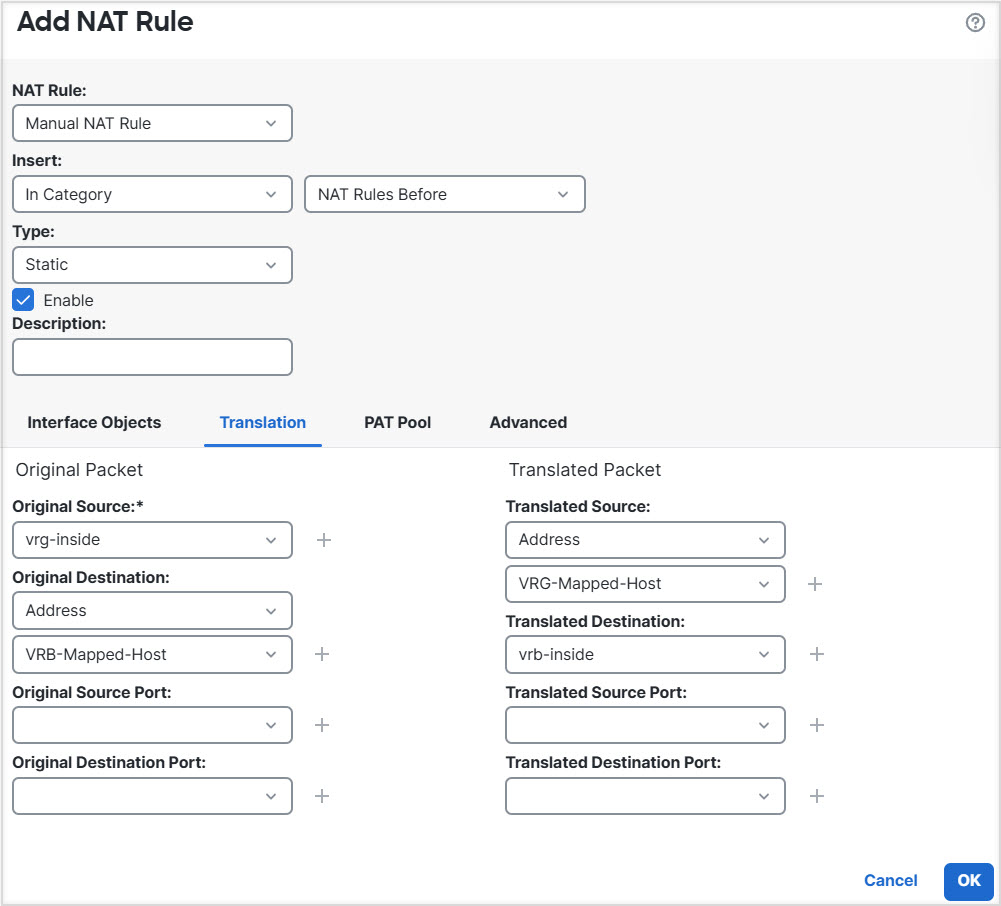 Step 4 | In the NAT page, click Add Rule and define the following: