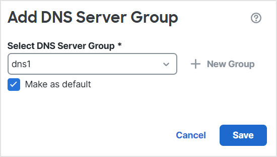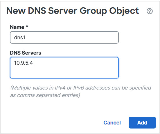 Step 5 | Either select an existing DNS server group (see Creating DNS Server Group Objects), or click ( If you add a new group, you see the following dialog box. Provide a name and up to four DNS server IP addresses as comma-separated values, and click Add.