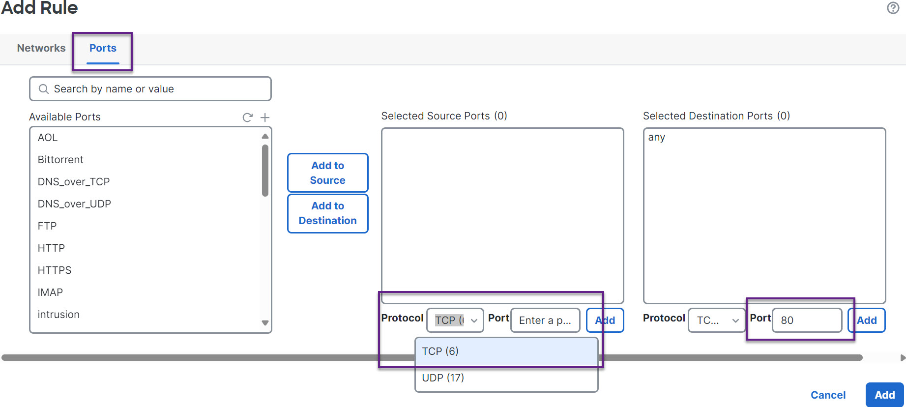 Step 10 | For the source port, choose Protocol as TCP and enter 80 as the destination port, and click Add.