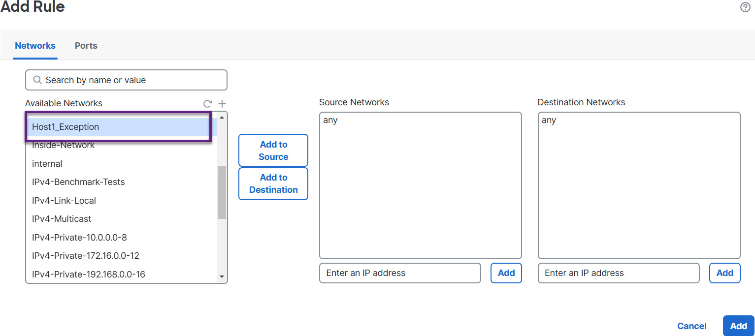 Step 7 | From the list of Available Networks, choose the configured host to exempt from elephant flow remediation. For the purposes of this example, we have created a host called “Host1_Exception.”