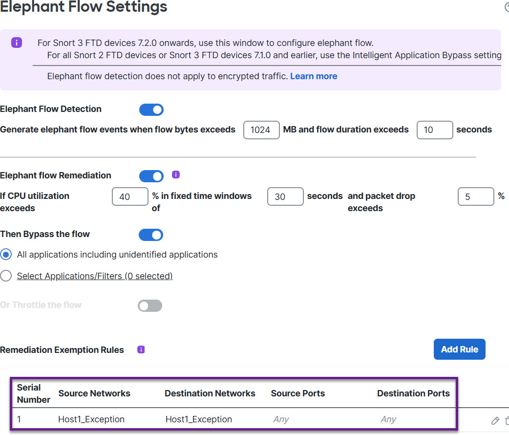 You can configure L4 access control list (ACL) rules for flows that must be exempted from remediation. If a flow is detected as an elephant flow and it matches the rules that are defined, that flow is exempted from the remediation action.