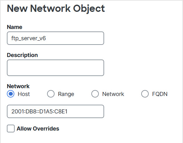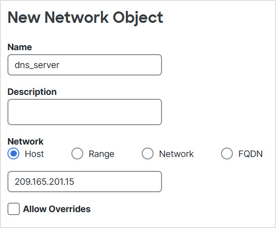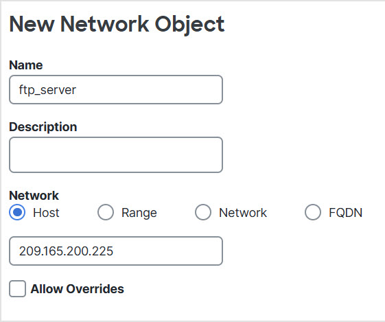 Step 1 | Create the network objects for the FTP server, DNS server, inside network, and PAT pool. |