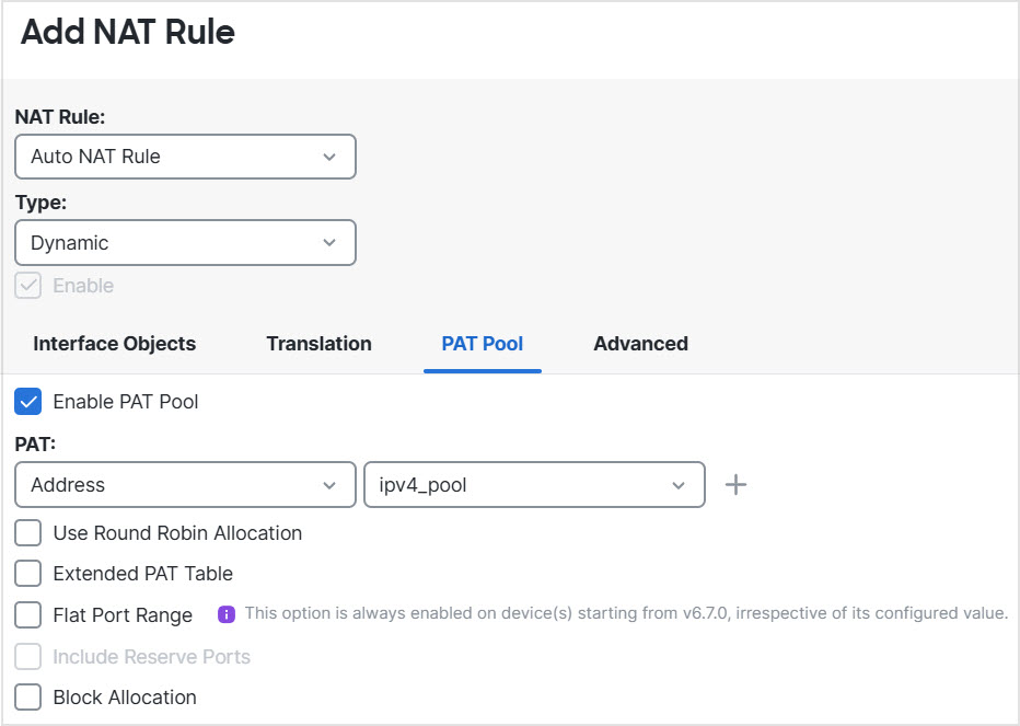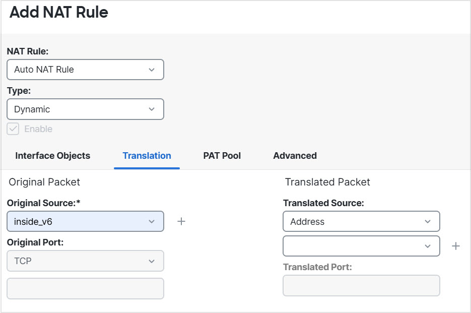Step 4 | Configure the dynamic NAT with a PAT pool rule for the inside IPv6 network. |