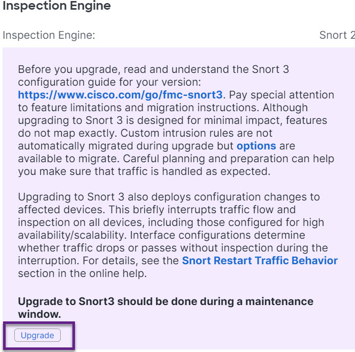 Step 4 | In the Inspection Engine section, click Upgrade.