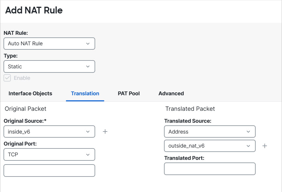 You can configure a static translation between IPv6 address pools using auto NAT. The following example explains how to convert inside addresses on the 2001:db8:122:2091::/96 network to outside addresses on the 2001:db8:122:2999::/96 network.