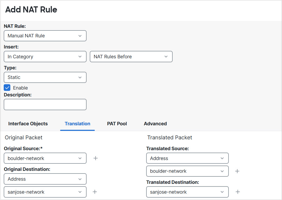 Step 2 | Configure manual identity NAT for the Boulder network when going over the VPN to San Jose on Firewall1 (Boulder). |
