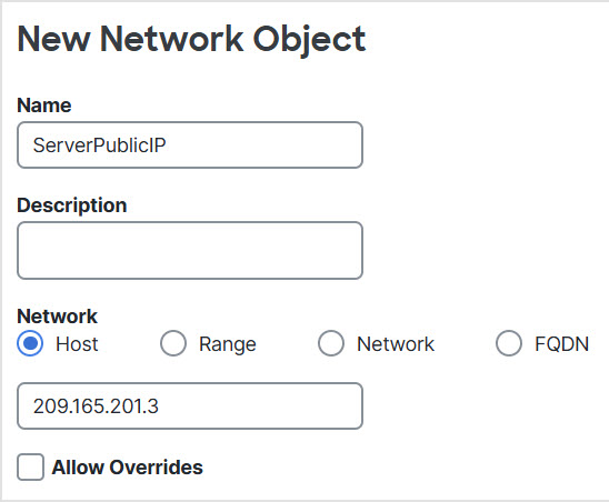 Step 4 | Create a network object for the public IP address used for the three servers. |