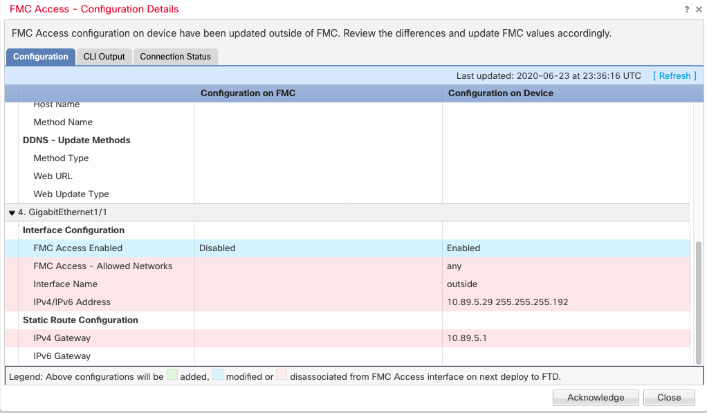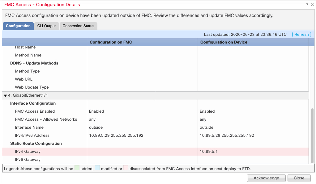 This procedure describes how to manually sync interface changes if required and how to acknowledge the detected changes. If interface changes are temporary, you should not save the changes in the Firewall Management Center; you should wait until the device is stable, and then re-sync.
